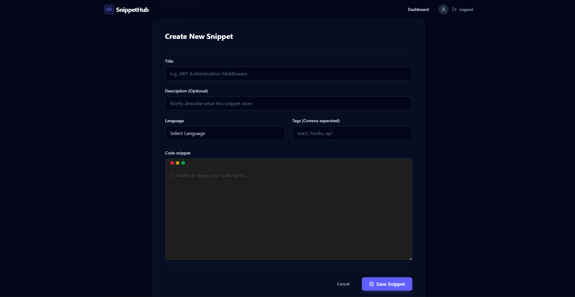 - Dashboard: The main control center where users see all their saved work. If no snippets exist, an inviting empty state encourages the user to create their first one.